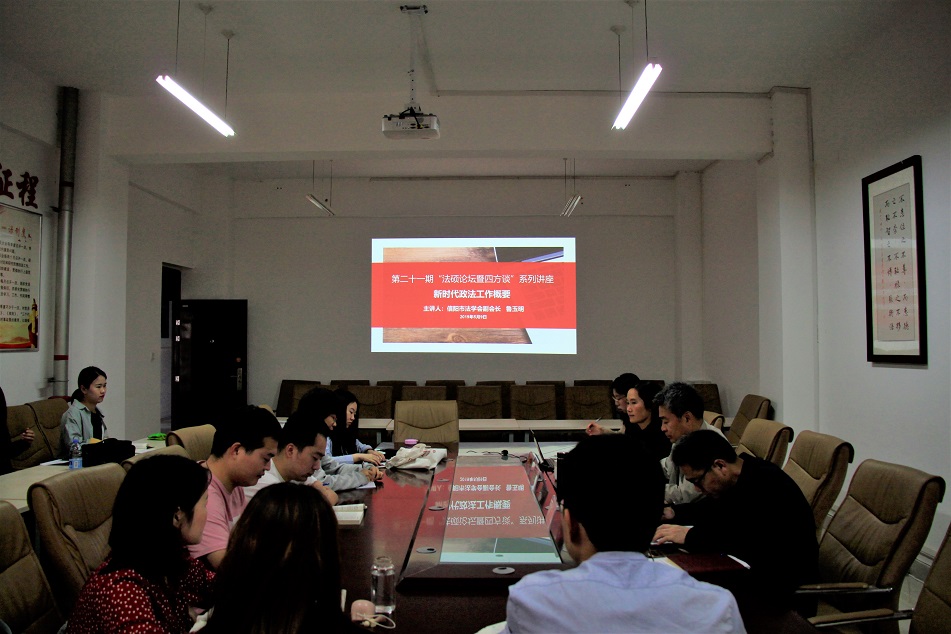 在讲座环节,鲁玉明以习近平总书记关于政法工作的重要讲话精神为出发点,结合自己在信阳市政法委和信阳市法学会的长期工作经历,从政法工作的指导思想、工作目标、遵守原则、具体内容、典型案件解读等十一个方面,对新时代我国政法工作进行了全面、精准的介绍。他说,新时代政法工作的重要性不断加强,政法委工作必须坚持习近平新时代中国特色社会主义思想为指导,坚持党的绝对领导,做到政治性、专业性和人民性的统一。政法队伍要努力做到革命化、正规化、专业化、职业化。政法委要为政法单位之间的协调、为社会综合治理等各个方面发挥指引作用。