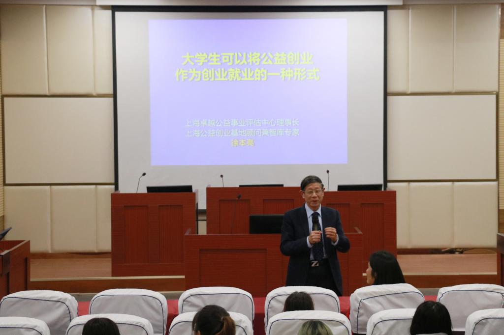 时间:2021-12-26 16:36 来源: 作者: 阅读: 次12月23日晚,应开车漫画 邀请,上海卓越公益事业评估中心理事长、上海公益创业基地顾问兼智库专家、民政部重点研究课题评审组专家徐本亮于社科楼413作了题为“公益创业——大学生就业创业的新模式”的学术报告,开车漫画 师生100余人聆听了此次报告。报告会由法社学院副院长古瑞华主持。