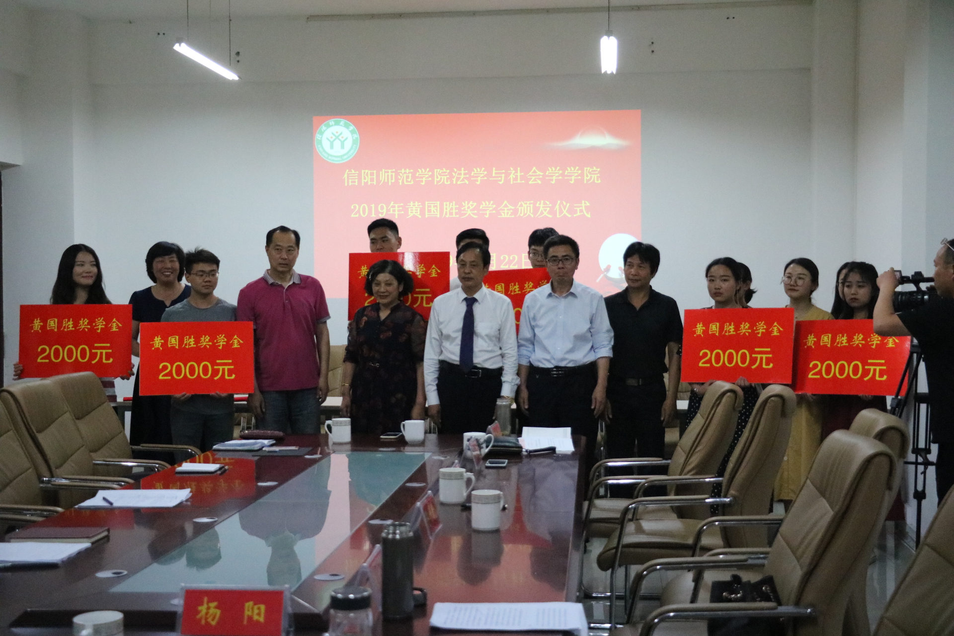 仪式上,法社学院副院长贾义保宣读了《关于表彰孙世杰等10名同学为“圆梦谭山”-2019年黄国胜奖学金获得者的决定》,黄国胜主任和耿劲松处长一同为获奖同学颁发了证书及2000元奖学金。