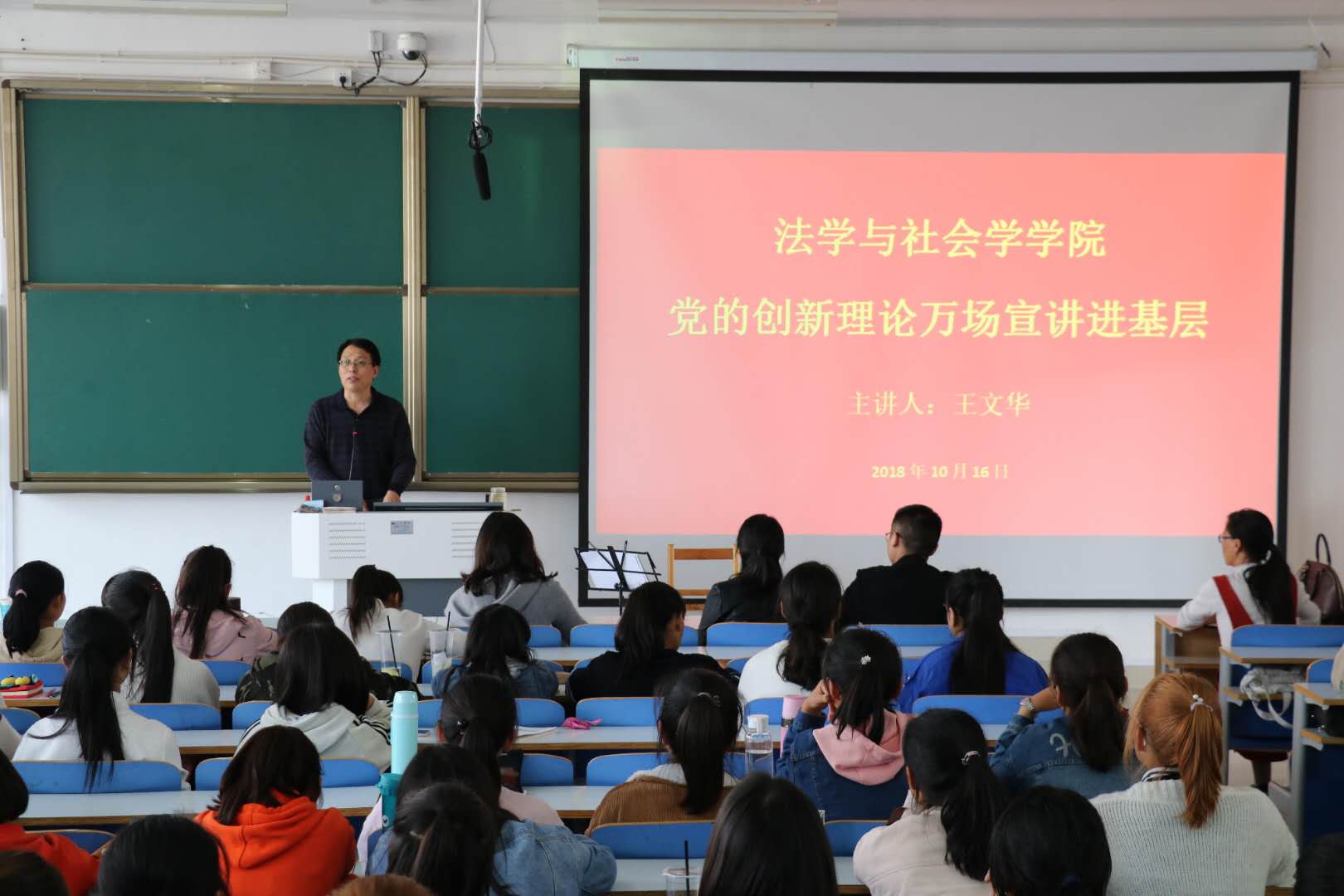 时间:2018-10-17 18:43 来源: 作者:admin 阅读: 次10月16日,法社学院在社科楼517举办了第三场“党的创新理论万场宣讲进基层”活动,法社学院党委书记王文华担任主讲人。袁艳红、王一帆、王艳丽、杨胜利老师以及2018级全体新生共同参加了活动。