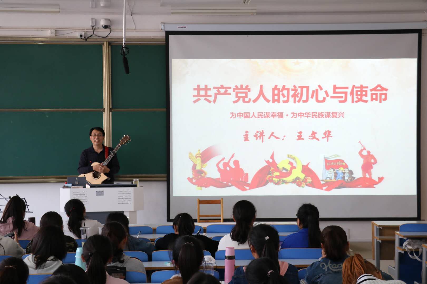 主题报告中,王文华分别以教师、校友、父亲三身份与同学们进行了深情交流。伴随着吉他伴奏,王文华倾情演唱了《我的中国心》《今天是你的生日》《同桌的你》《光阴的故事》《妈妈留给我一首歌》《成都》等脍炙人口的优秀歌曲,赢得了同学们阵阵掌声。同学们纷纷表示特别喜欢这样的讲党课的方式,既学习了党的基本理论又提高了艺术修养,严肃而不乏活泼。