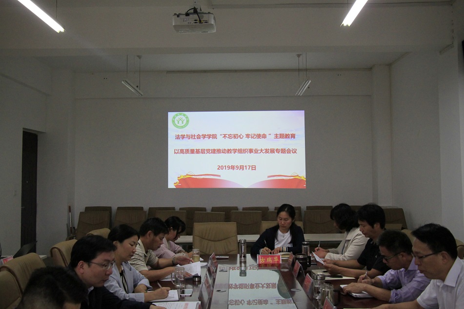 时间:2019-09-18 18:16 来源: 作者:王一帆 阅读: 次9月17日下午,法社学院在社科楼412会议室召开“不忘初心、牢记使命”主题教育——以高质量基层党建推动教学组织事业大发展专题会议。学院党委委员、教工党支部支委、各基层教学组织负责人参加会议。党委书记王文华主持会议。