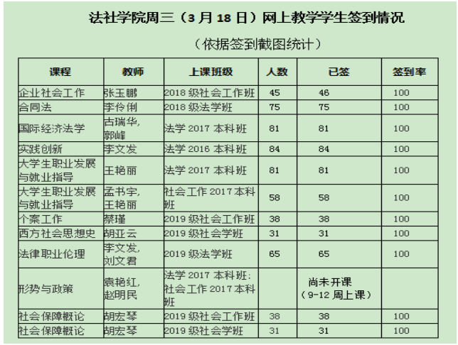 时间:2020-03-19 09:59 来源: 作者: 阅读: 次为有效遏制新型冠状病毒感染的肺炎传播,切实保障师生身体健康和生命安全,根据信阳师范学院《关于做好2020年春季学期延期开学期间本专科教学工作的通知》要求,法社学院高度重视网络教学工作。2月24日以来,53门次本科生课程开启在线教学,实现了”停课不停学,停课不停教“目标。