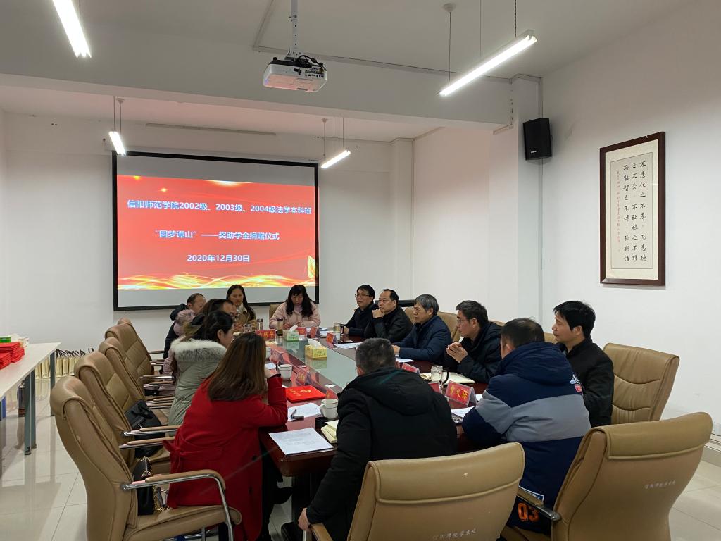 时间:2020-12-31 15:58 来源: 作者:古瑞华 阅读: 次2020初雪悄然而至,法社校友“圆梦谭山”行动温暖开启。12月30日,法学专业校友“圆梦谭山”奖助学金捐赠仪式在法社学院会议室举行。校长李俊出席活动。2002级法学班校友、中原银行信阳分行公司类清收中心总经理卢建广,2003级法学2班校友、潢川县宣传部文明城市创建室主任王瑛琳、信阳市人大内司工委副科长雷莉,2004级法学1班校友、平桥区自然资源局一级科员董正俊代表各班校友来校捐赠。对外联络处、法社学院负责同志以及法社学院各班集体班长、团支书参加捐赠仪式。法社学院党委书记王文华主持仪式。
