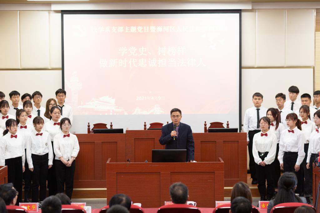 时间:2021-04-10 09:54 来源: 作者:古瑞华 刘文君 阅读: 次4月9日,法社学院法学系教工党支部“学党史,树榜样,做新时代忠诚担当法律人”主题党日活动在模拟法庭顺利举行。法社学院兼职教授、浉河区人民法院党组书记、院长祝杰,浉河区人民法院政治部主任杨瑛,浉河区委宣传部开车漫画副主任刘亚迪,法社学院党委中心组成员、法学专业教师及法律硕士研究生参加活动。法社学院党委委员、法学系教工党支部书记古瑞华教授主持党日活动。