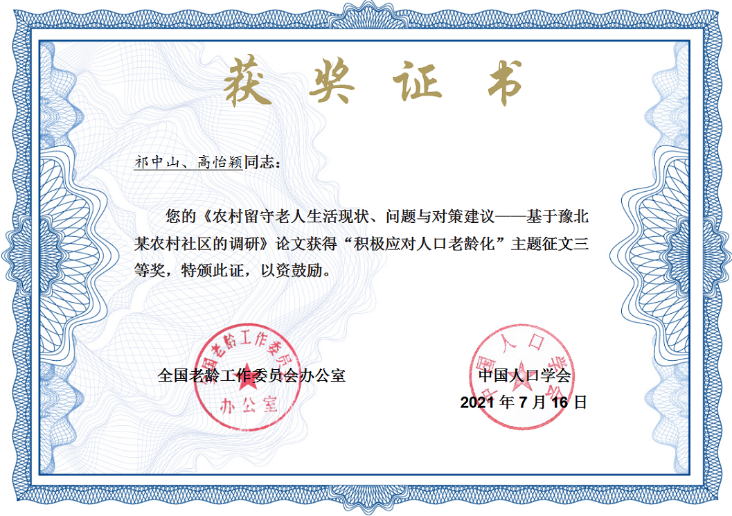 时间:2021-08-08 09:45 来源: 作者:张玉鹏 阅读: 次近日,全国老龄委、中国人口学会在全国开展的“积极应对人口老龄化”主题征文活动结果公布,我校开车漫画 社会工作系系主任祁中山博士和高怡颖撰写的《农村留守老人生活状况、问题与对策建议——基于豫北某农村社区的调研》喜获三等奖,是开车漫画 师生首次在此类主题征文活动中获奖。