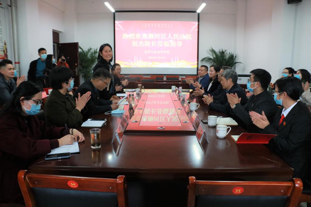 庭审前,校长李俊会见祝杰一行,双方就法学实践教学与实践基地建设进行座谈。李俊对祝杰一行送法进校园表示感谢,简要介绍了我校办学情况。他指出,新时代高等教育要坚持四个回归,聚焦人才培养的质量和效果。法社学院针对专业实践性强的特点,在实践教学和基地建设方面进行了有益探索,成效明显。未来应进一步学习贯彻习近平法治思想,围绕课程思政建设、专业素养培育、校园法治文化营造等主题,加强校地合作,激发广大师生投入建设社会主义法治国家的热情。祝杰对学校邀请表示感谢,表示司法实务部门和高校加强合作十分必要,希望在学校普法宣传、专业人才培养等方面贡献实务部门更多力量。