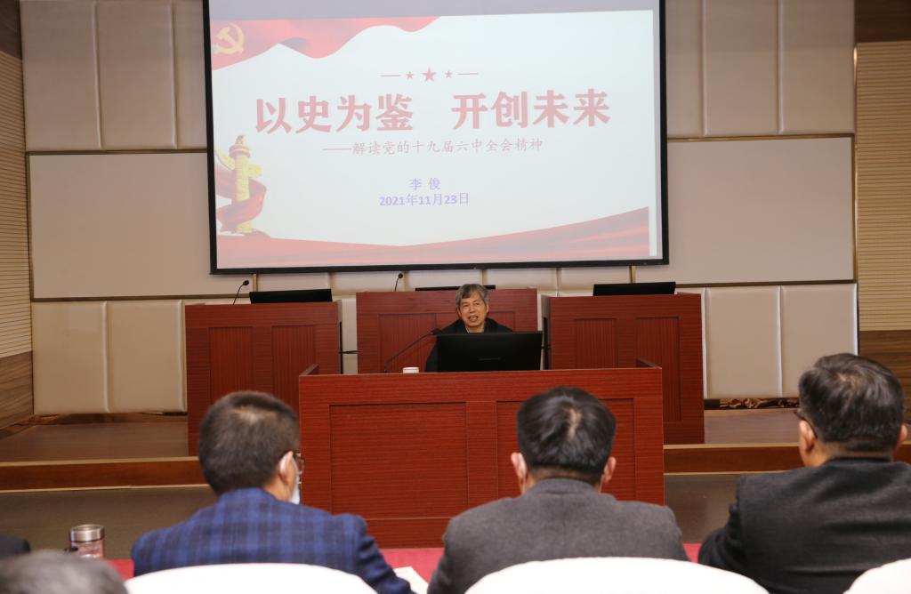 报告会上,李俊以学习贯彻党的十九届六中全会精神、学好《中共中央关于党的百年奋斗重大成就和历史经验的决议》为主题,从“重大意义”、“重要贡献”、“重点内容”三个方面,深入解读了学习贯彻党的十九届六中全会精神应把握的指导思想、基本原则、核心内容和方式方法。他指出,十九届六中全会通过的《决议》的重大意义体现在四个方面:一是对于始终坚持道路自信、走好中国道路意义重大;二是对于始终坚持理论自信、理论创新发展意义重大;三是对于始终坚持制度自信、完善制度体系意义重大;四是对于始终坚持文化自信、繁荣文化发展意义重大。关于《决议》的重大贡献,李俊强调,《决议》是对重大时代课题的新拓展,是对科学理论内涵的新概括,是对科学理论创立的新确定,是对时代思想精华的新界定。关于《决议》的重点内容,李校长从十一个方面进行了总结:通过“一个决议”;强调“两个确立”;实现“三大飞跃”;贯穿“四个时期”;明确“五大意义”;深入“六项研究“;规划“七个部分“;总结”八条秘诀“;聚焦”九年实践“;集成”十个坚持“;概括”十三个成就“。最后,李俊校长强调:以史为鉴,开创未来,既是中国共产党人一以贯之的优良传统,又是当代中国共产党人高度的历史自觉和历史自信。站在实现伟大梦想的新起点上,广大教师要从党的百年奋斗重大成就和历史经验中汲取奋进力量,把握历史发展大势,坚定理想信念,牢记初心使命,用实际行动践行“请党放心,强国有我”的使命担当,为实现第二个百年奋斗目标、实现中华民族伟大复兴的中国梦而不懈奋斗!