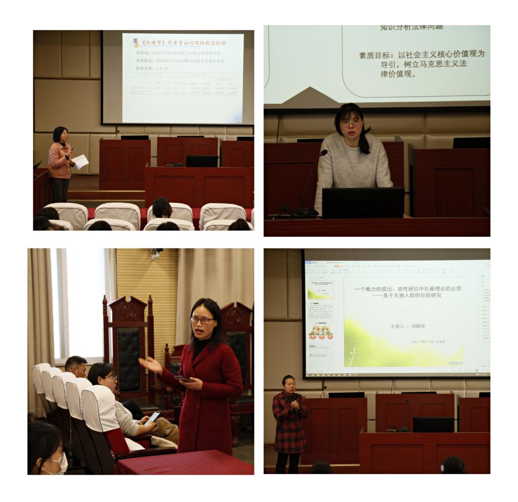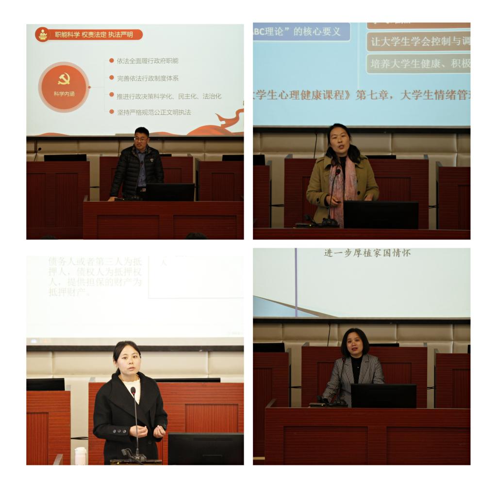 本次大赛经精心筹备,于2021年11月初启动,6个基层教学组织在充分听课评课的基础上推荐了8名教师参加。赛前每位参赛教师提供1套主讲课程的教学大纲和章节的教学设计。现场比赛环节,参赛教师先说课,再加20分钟的讲课演示,最后回答专家提问,由学院领导和基层教学组织负责人组成的评审专家组进行现场打分。比赛现场气氛热烈,精彩纷呈,各位参赛教师把现代教育技术与课堂教学深度融合,积极探索运用学习通、雨课堂等平台进行项目式教学、探究式教学、混合式教学、“翻转课堂”等新的教学模式;将家风、家训、家教等思政元素融入社会治理理念;将刚刚采集的社会调查素材、古诗词及经典著作的数理分析融入课堂教学,全面展示课堂教学创新元素,凸显了“教师为主导,以学生为中心”的教学理念。