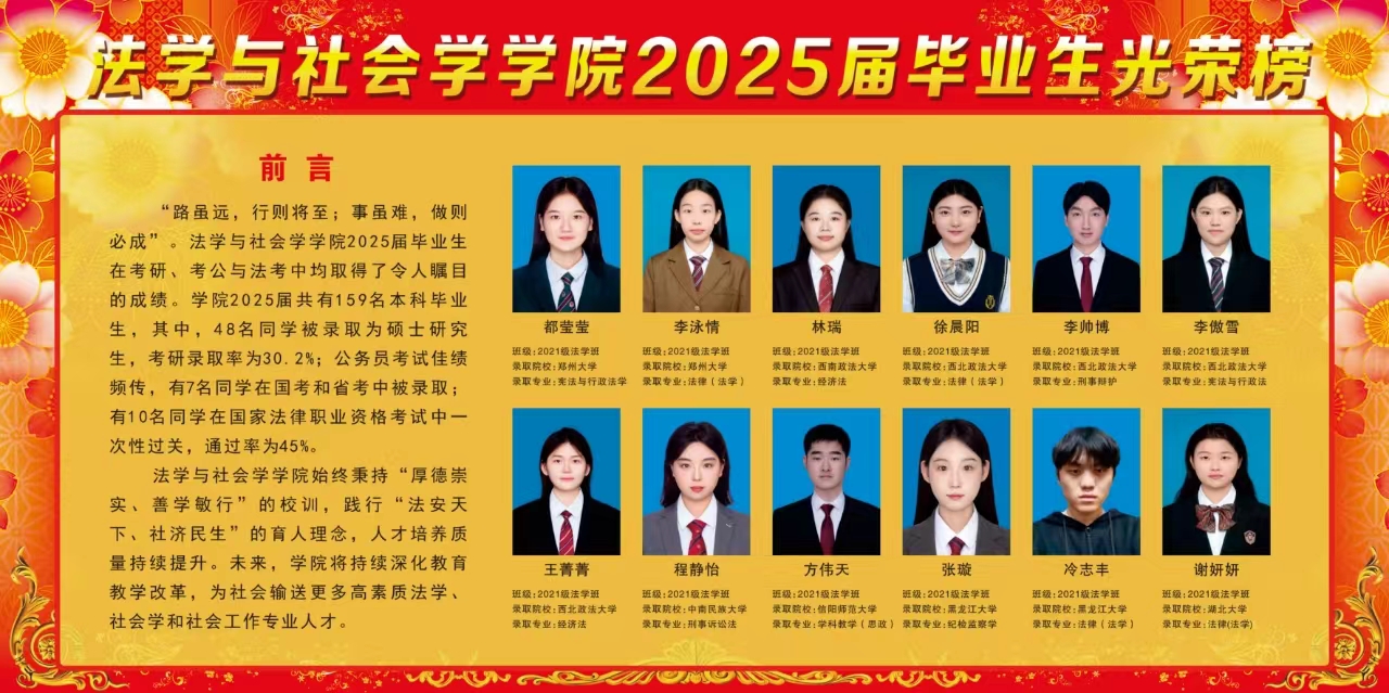 时间:2025-05-22 18:29 来源: 作者: 阅读: 次“路虽远,行则将至;事虽难,做则必成”。法学与社学学院2025届毕业生在考研、考公与法考中均取得了令人瞩目的成绩。学院2025届共有159名本科毕业生,其中,48名同学被录取为硕士研究生,考研录取率为30.2%;公务员考试佳绩频传,有7名同学在国考和省考中被录取;有10名同学在国家法律职业资格考试中一次性过关,充分体现了学院教育教学改革和人才培养的显著成效。