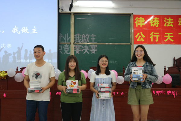在经历了激烈的初赛后,成绩优异的四个战队进入决赛,进行新一轮的角逐。决赛主要以答题的活动形式开展,主要分为必答环节、眼疾手快、快人快语、风险题四个环节。在必答环节,各组战队选出代表进行答题,代表们知识储备雄厚,力求答题完美,赢得高分数;在眼疾手快环节,各组通过扎气球的方式赢得答题机会,现场一片热闹,将比赛推向高潮。快人快语环节充分考验了参赛选手的反应速度和知识积累;在风险题环节中,各小组成员就“三方协议”、“毕业生义务征兵”等主题进行演讲,讲述他们对毕业生就业知识的理解。伴随着对获奖同学的祝贺声和掌声,此次知识竞赛圆满结束。